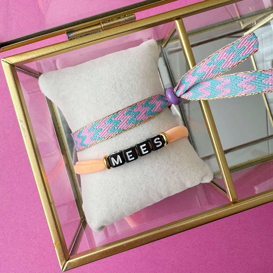 Vrolijke armband met felle kleurtjes, met een schuifkraal als sluiting. Dus deze armband past iedereen.